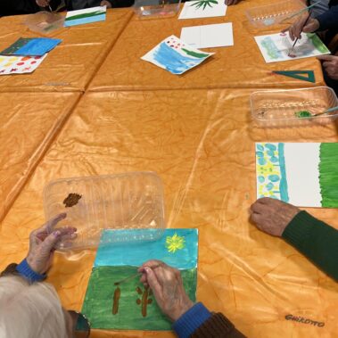 Abbiamo così scoperto che creare bellezza con i colori e con la vegetazione è un’attività piacevole e gratificante: si sono susseguite allora attività di stampo creativo, dove l’assemblaggio materico ha costituito un’esperienza del tutto nuova. Molti ospiti sono abili con le mani, altri invece le hanno usate in passato solo per svolgere il lavoro quotidiano. Sperimentare pratiche dedicate al solo piacere personale, utili solo ad abbellire la propria residenza, ha rappresentato per i partecipanti uno stimolo inatteso, un’esperienza mai realizzata prima.